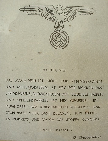 We are informed that cod-German parodies of this kind were very common in Allied machine shops during and following WWII. Germans, then as now, had a reputation for being both good with precision machinery and prone to officious notices.